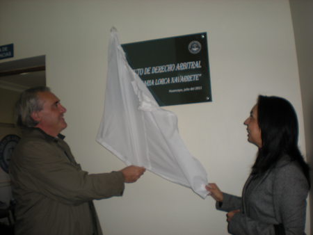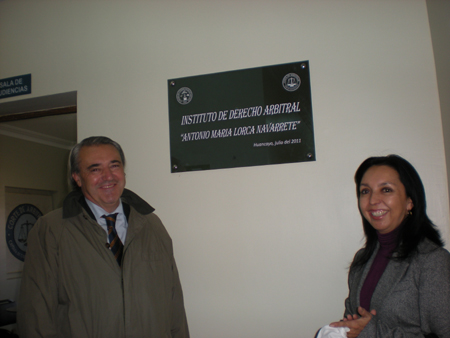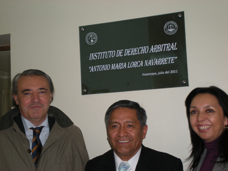 El día 23 de julio de 2011, en horario de mañana, tuvo lugar en la sede de la Cámara de Comercio de Huancayo la inauguración oficial del Instituto de Derecho Arbitral "Antonio María Lorca Navarrete" dependiente de Corte de Arbitraje de la Cámara de Comercio de Huancayo. En la foto el Prof. Dr. Antonio María Lorca Navarrete, Catedrático de Derecho Procesal y Derecho de Arbiraje de la Universidad del País Vasco (España) y Presidente de la Corte Vasca de Arbitraje acompañado de la Presidenta de la Cámara de Comercio de Huancayo Dª. Yannina Traverso García proceden a descubrir, en la sede de la Cámara de Comercio de Huancayo, la la placa por la que queda inaugurado oficialmente el Instituto de Derecho Arbitral "Antonio María Lorca Navarrete".